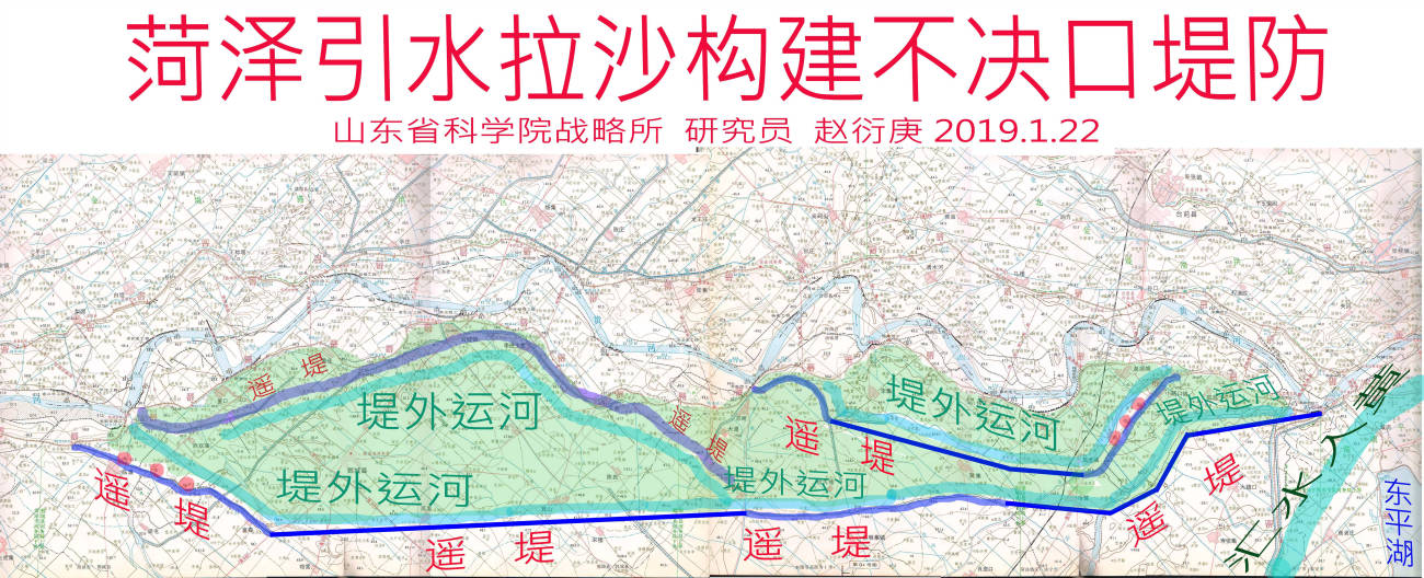 二、菏泽建设宽河道的不决口堤防,活力带不决口堤防功能强大,就是洪水溢堤,也不会发生堤防决口。而且有堤外运河的输水入黄,并能通航兴利,是菏泽段黄河防洪与兴利治理的根本转变。并使东平湖丧失了滞洪功能,也消除了菏泽河道径流向黄河泄洪退水的障碍。取消东平湖为黄河滞洪功能,可保持为大汶河防洪调节与兴利湖泊功能,在东平湖大坝之外加深原京杭运河,由引黄济南四湖工程,调整为菏泽泄洪入黄河道,有利于南四湖北水北用,进而恢复京杭运河的输水通航。