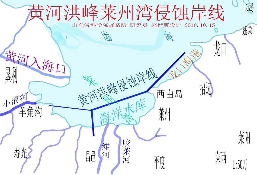 青岛海洋大学侯国本教授研究,莱州湾是个弱潮区,东营建设了黄河海港。黄河洪水泥沙在渤海内淤积,影响河道纵比降,依然存在黄河改道问题。对策是形成渤海内莱州湾的黄河洪峰泥沙流的侵蚀岸,以顺利进入深海。 受月球科氏力影响,黄河下游以南岸为侵蚀岸,一般堤防南岸要比北岸高出20cm—40cm,还有加宽。如果在莱州湾设计建设,从小清河入海口以南,至莱州市西由岛的海洋大坝,从西由岛至龙口的岛之间,还可修建海湾大坝,既形成完整的黄河洪峰泥沙入深海的侵蚀岸线,还为龙口规划设计大型海港。将使烟台中心具有了区域国际经济流通中心的基础设施开发优势。 目前的引黄济青工程,枯水年超负荷运转,还难以满足青岛市区的供水需要,其他地区既要为青岛重点城市供水让路,三农用水更无着落,成为青岛、烟台两中心和半岛经济区的突出水资源问题。在莱州湾建设海洋水库,将是半岛水资源问题的根本解决途径,也连接起山东半岛,成为黄河流域经济带龙头,以奔向深蓝。