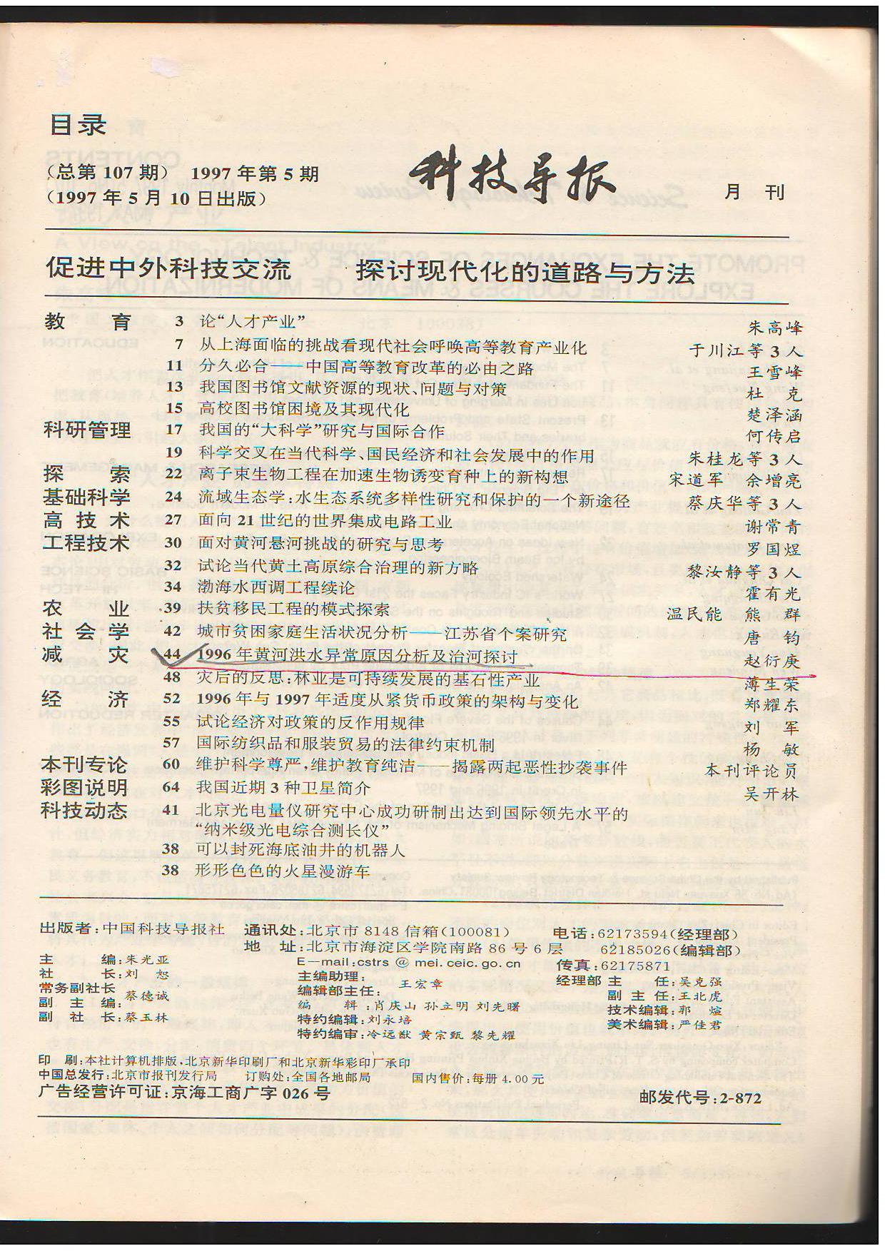 九、《1996年黄河下游洪水异常原因分析及治理探讨》赵衍庚《科技导报》1997年5期 总第104期